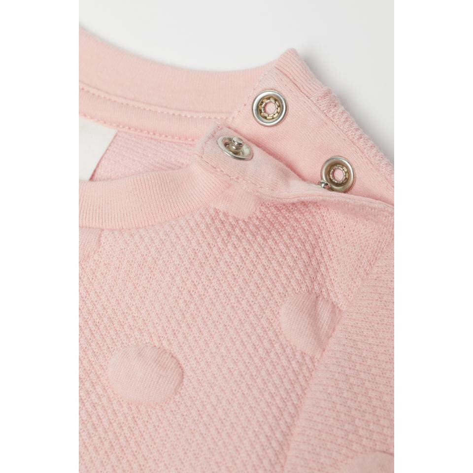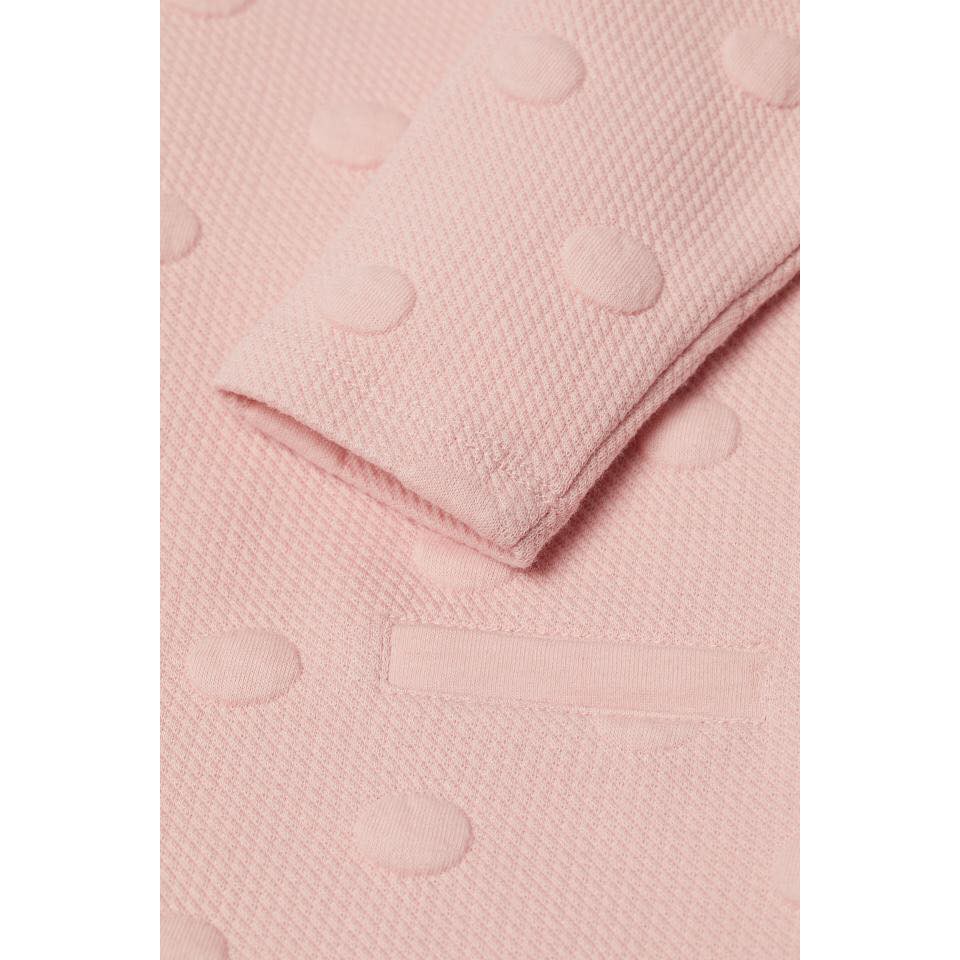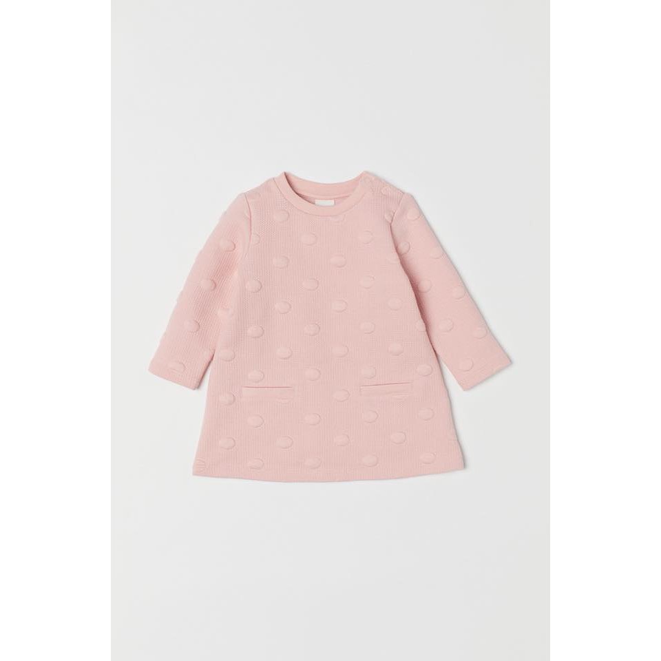 Áo váy H&M bé gái tay dài • Made in Cambodia • Form chữ A, một màu hồng phấn, vải dập bi nổi, 2 túi trước giả, nút bấm một bên vai, nhãn m...